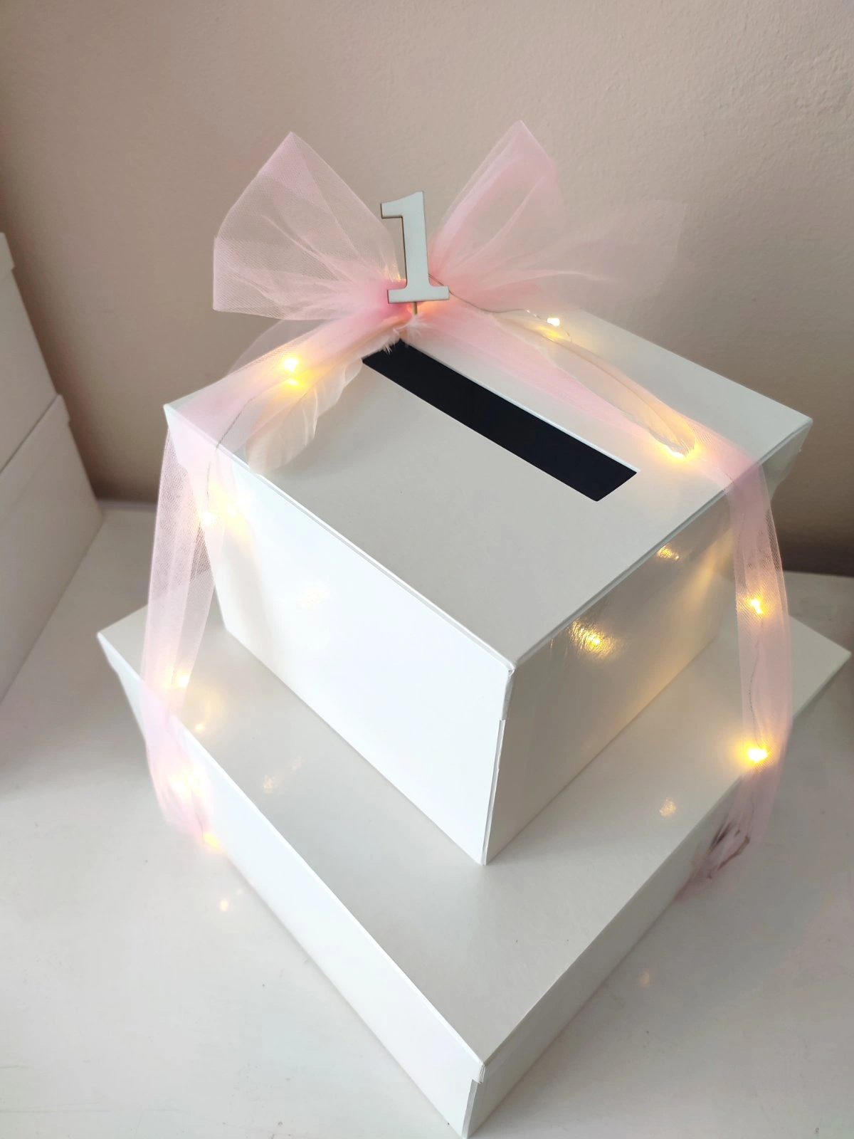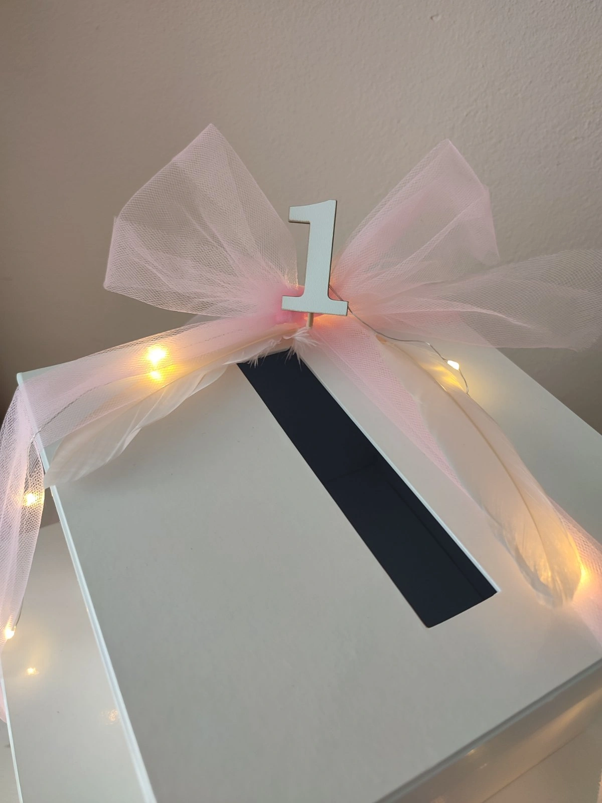 Svetleća kutija za koverte je prava magija na prvim rođendanima. Sastoji se od dve kutije koje su fiziki pričvršćene i zajendo čine kutiju za koverte na sprat. Zatim, obavijena je nežnom mašnom od roze tila na čijem se centralnom delu nalazi broj 1. I ono što je čini toliko magičnom jesu svetlucave lampice ispod tila sa dve strane.